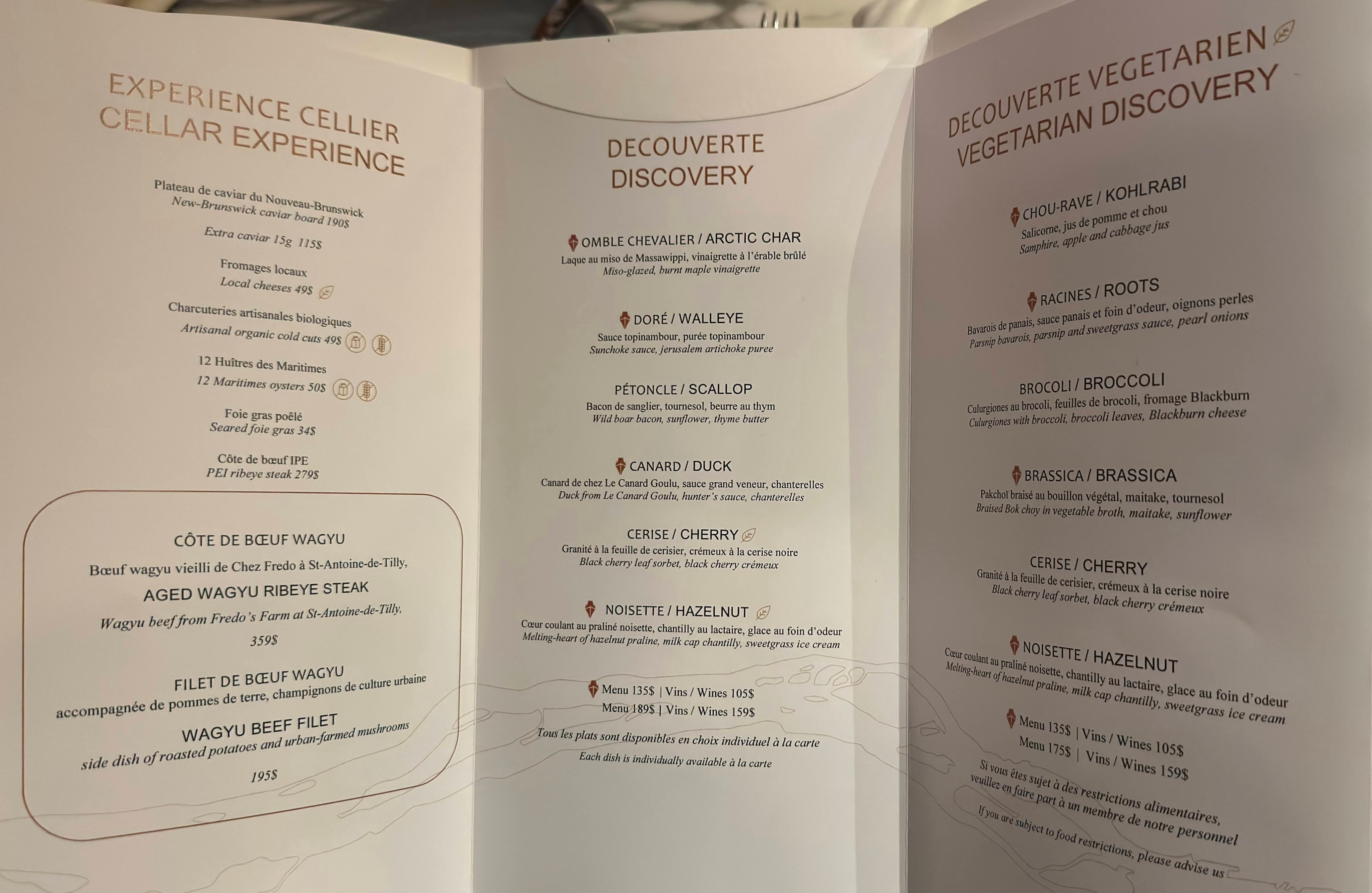 • Menu Options: Prix fixe menus (4 or 6 courses) are available for adults (C$140–C$190) with optional wine pairings (C$100–C$150). A thoughtful 4-course children’s menu is priced at C$90.