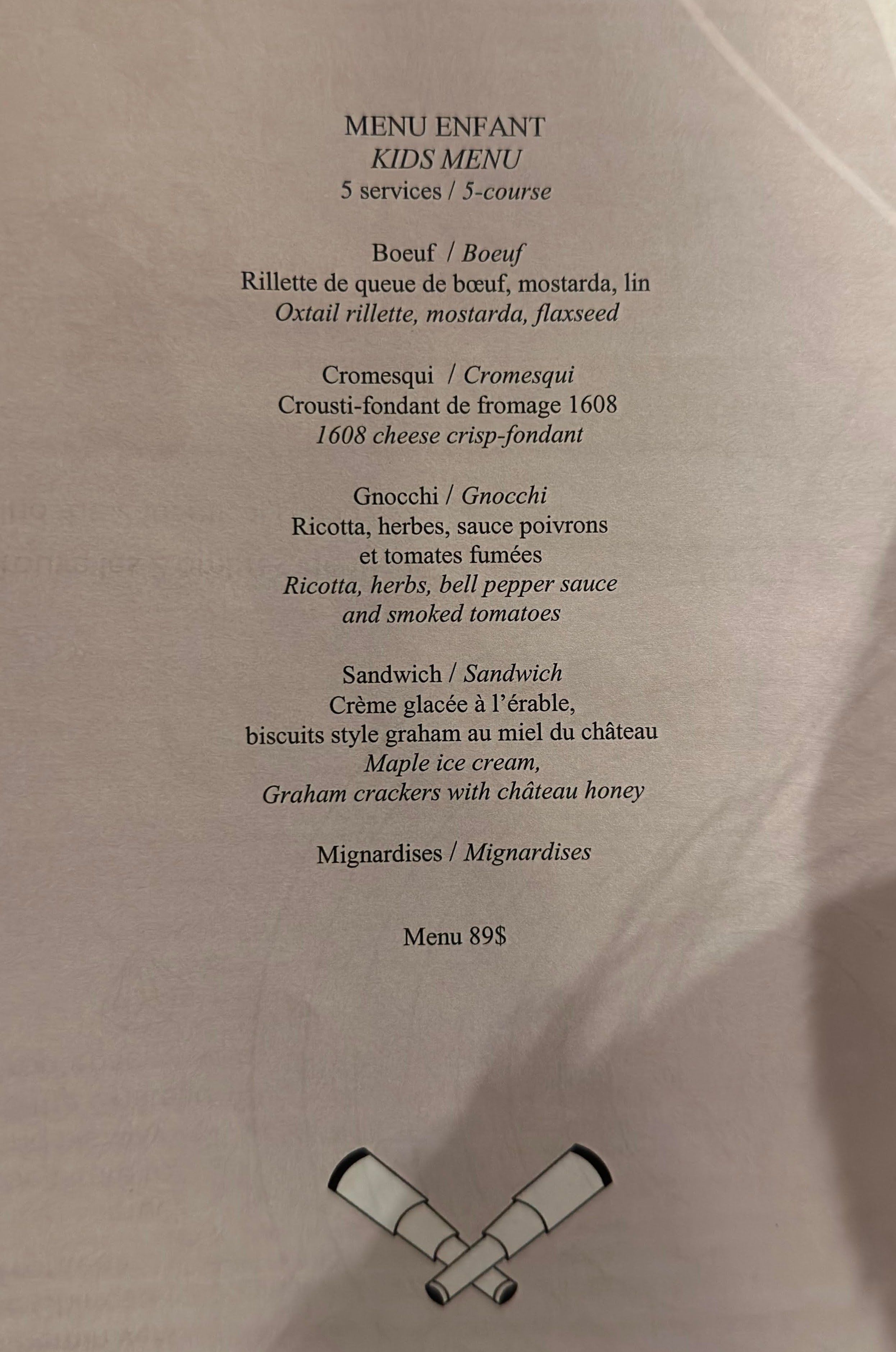 Champlain offers both à la carte and prix fixe options. The prix fixe menu featured four-course and six-course choices for adults, priced at approximately C$140 and C$190, respectively, with an optional wine pairing ranging from C$100–C$150. The children’s menu was also prix fixe, offering a four-course meal for C$90. Our group opted for a mix of the prix fixe options, with one diner choosing the wine pairing, while the children enjoyed their curated menu.