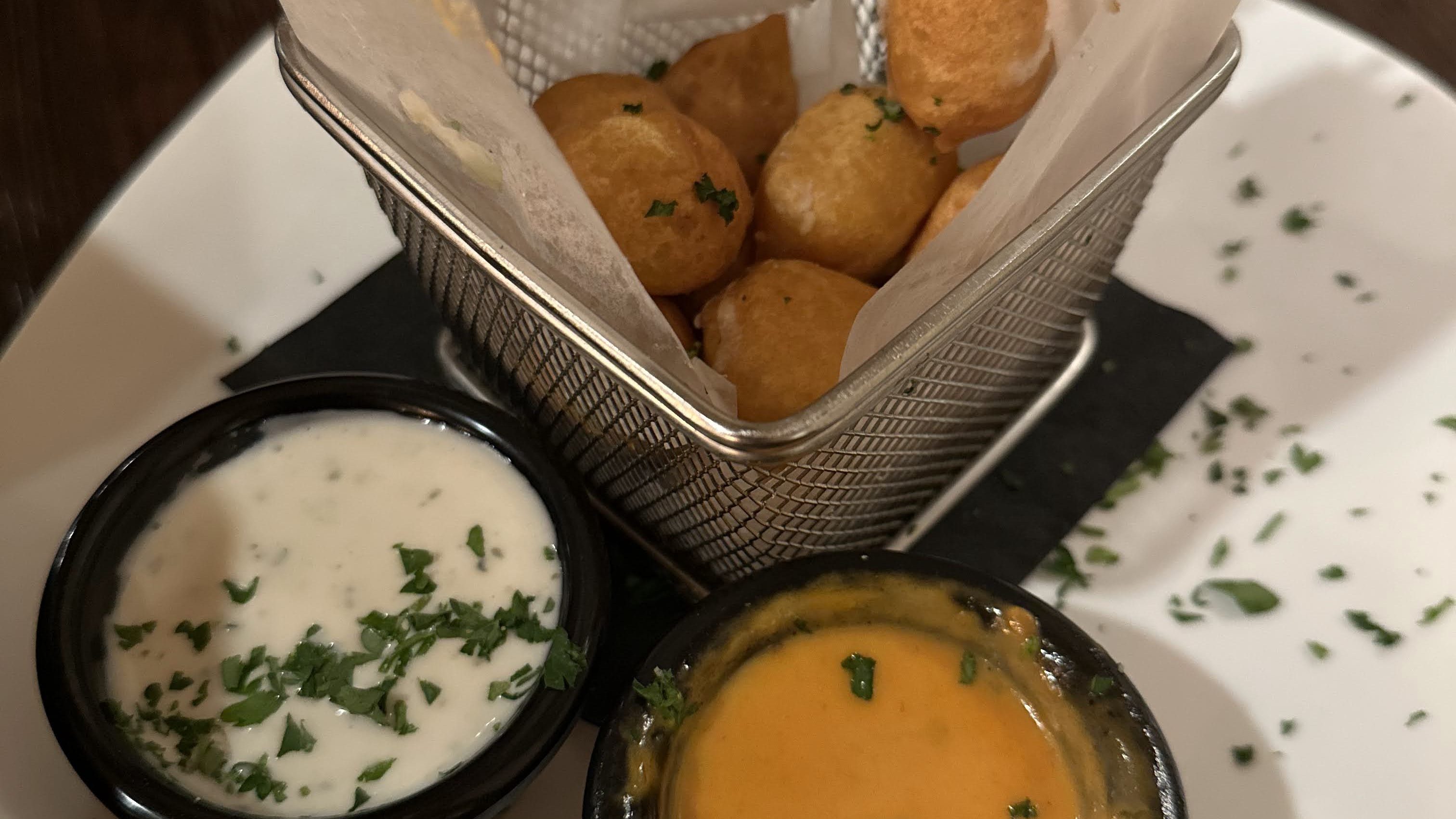 The highlight of our experience was undoubtedly the food. We started with the fried stuffed gnocchi, a standout appetizer. The gnocchi were perfectly crispy on the outside, soft and rich on the inside, and served with vodka and ranch dipping sauces. Be warned—they’re served fresh out of the fryer, so they’re piping hot!